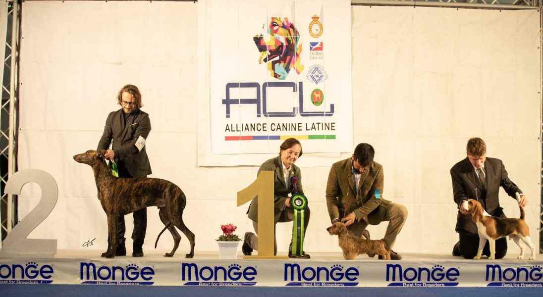 Rome international dog show, 19th of november 2023, greyhounds Kollaps The Meek Shall Inherit the Heart e Kollaps The temptation of Saint Anthony won each class, Best Opposite of Sex, Latin Winner 2023, BOB Puppy, 2nd Best in Show Puppy.